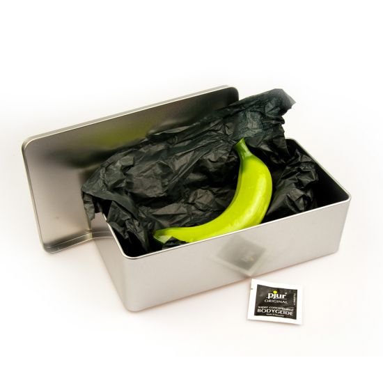 - Lieferung in einer silberfarbigen Metalldose, eingeschlagen in schwarzes Seidenpapier, inclusive einer Probe Gleitgel.