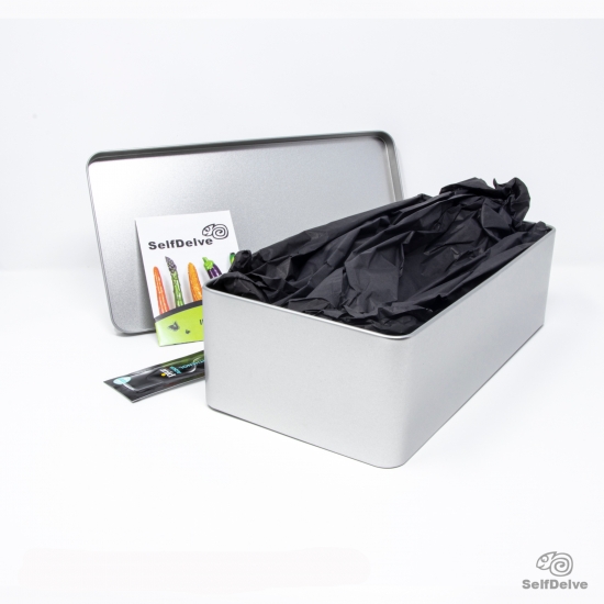 • Lieferung in einer silberfarbigen Metalldose, eingeschlagen in schwarzes Seidenpapier, inclusive einer Probe Gleitgel.