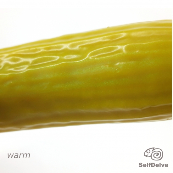 Die farbliche Gestaltung folgt im Wesentlichen der natürlichen Vorlage. Ein warmes Grün mit zarten perlmuttgrün-schimmernden Akzenten. Hat die Gurke Ihre Körpertemperatur angenommen, verblasst das Grün nach zartgrün-gelblich/weiß; ganz so, als wäre sie geschält worden.
